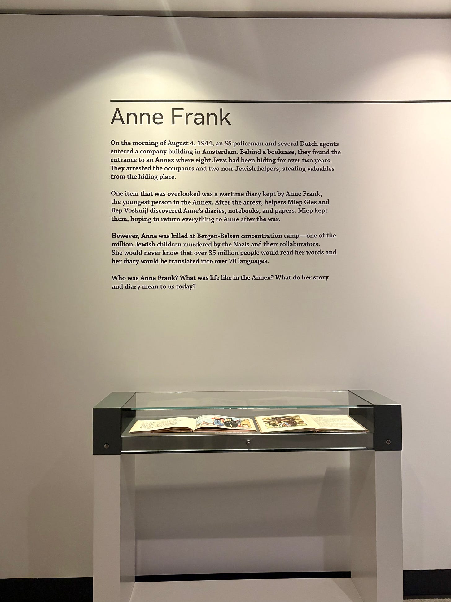 There’s a photograph of Otto Frank standing alone in the empty Secret Annex. The rooms are empty. He is looking off-camera, as if the photographer interrupted a private reckoning. That photo has always stayed with me, and it is shown here at the end of the exhibit, next to a glass case displaying all of the different editions and translations of Anne’s diary.